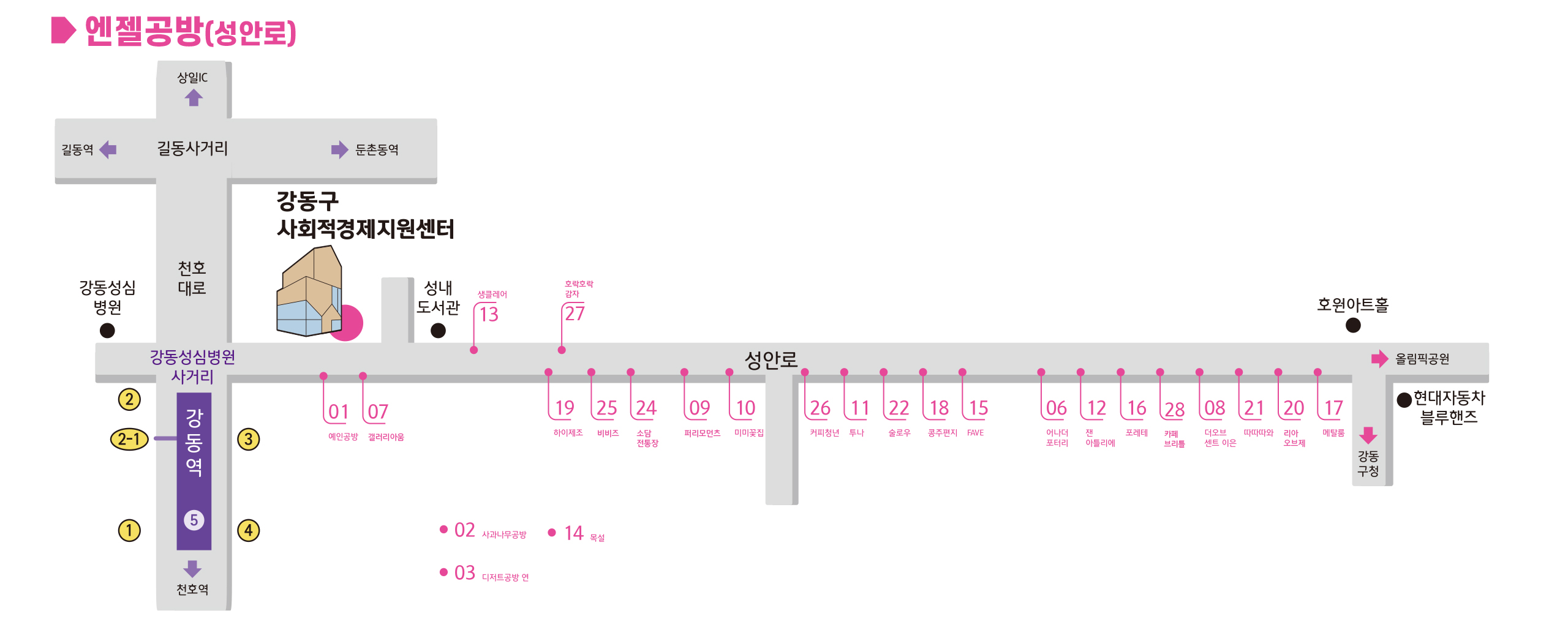 사업소개 엔젤공방 사업소개 공방현황 홍보자료 갤러리 영상자료 공방지도 엔젤공방이란? 강동구 성안로 공방거리를 조성, 지역경제 활성화와 청년 공예가에게 창업 기회를 제공 주요사업 ○ 공방 운영자 모집 및 운영 지원 – 신규 공방 운영자 선발, 오픈데이 운영 등○ 공방사업 홍보 – 엔젤공방 블로그, 인스타그램 운영 등○ 네트워크 활성화 – 엔젤공방 교류의날 등○ 판로개척 지원 및 연계 – 프리마켓 행사 운영, 기타 행사 연계 등 엔젤공방(성안로 일대)
