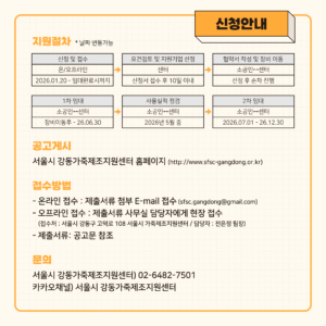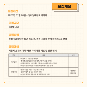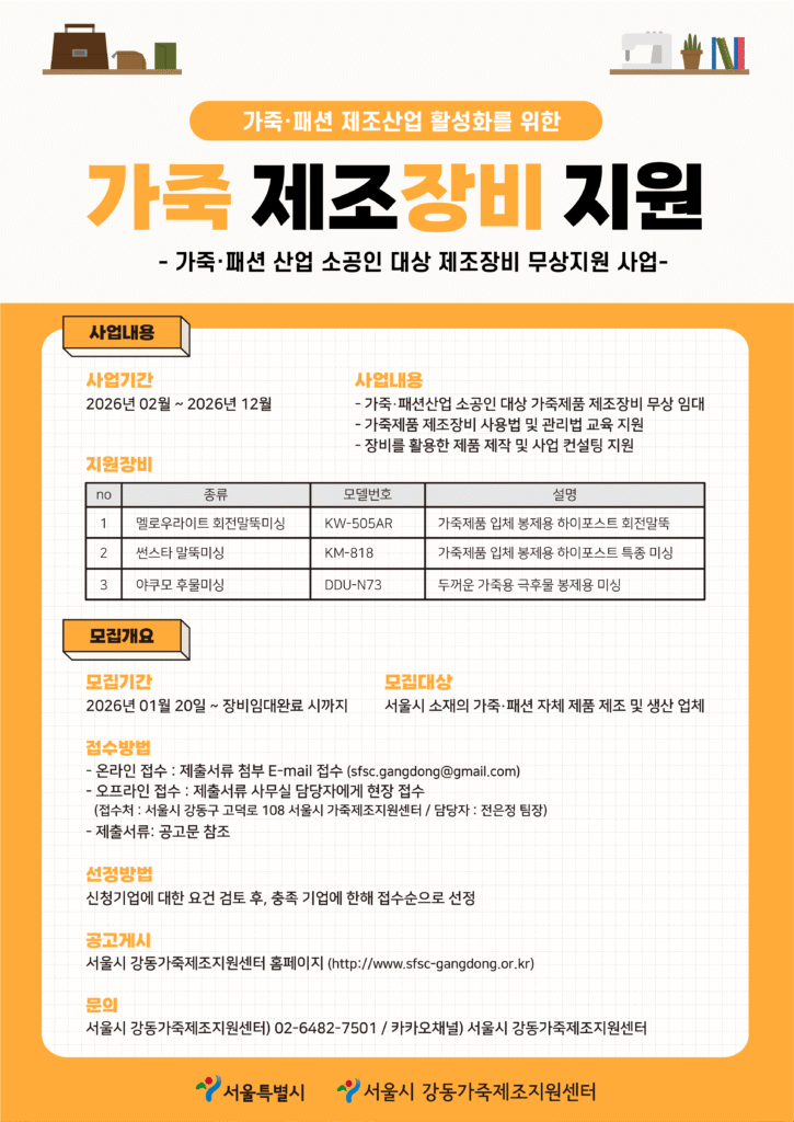 외부지원 사업안내 알림마당 공지사항 외부지원 사업안내 뉴스레터 자료실 갤러리 모집 중 [강동가죽제조지원센터] 가죽·패션산업 소공인 장비지원사업 참여기업 모집 일시(기간) ~장비임대완료시까지 종류 지원 신청방법 or 장소 문의처 서울시 강동가죽제조지원센터) 02-6482-7501 / 카카오채널 주최/주관 서울시 강동가죽제조지원센터 첨부파일 1 보기 / 다운로드 첨부파일 2 보기 / 다운로드 첨부파일 3 보기 / 다운로드 목록 보기