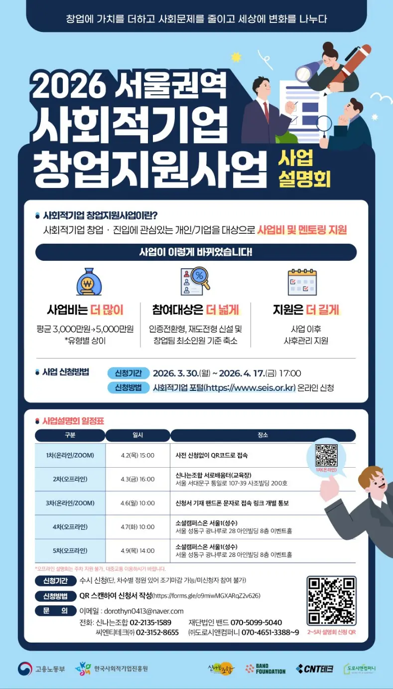 외부지원 사업안내 알림마당 공지사항 외부지원 사업안내 뉴스레터 자료실 갤러리 모집 중 [한국사회적기업진흥원] 2026년 사회적기업 창업지원사업 창업팀 모집 공고 일시(기간) ~4.17.(금) 17시까지 종류 지원 신청방법 or 장소 문의처 신나는조합 02-2135-1589, 재단법인 밴드 070-5099-5040, 씨엔티테크(주) 02-3152-8655, (주)도로시엔컴퍼니 070-4651-3388~9 주최/주관 고용노동부 / 한국사회적기업진흥원 첨부파일 1 보기 / 다운로드 첨부파일 2 보기 / 다운로드 첨부파일 3 보기 / 다운로드 원문링크–>> 한국사회적기업진흥원 「2026년 사회적기업 창업지원사업」 창업팀 모집 공고(3.30.(월) ~ 4.17.(금) 17시) – 공지사항 | 상세 ※ 자세한 내용은 원문링크에 접속하여 공고문, 신청서 등 확인하여주시기 바랍니다. 목록 보기